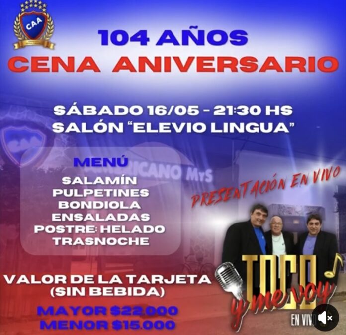El Club Americano se prepara para vivir una noche especial el próximo sábado 16 de mayo, en el marco de los festejos por su 104° aniversario, con la realización de una cena show abierta a toda la comunidad.