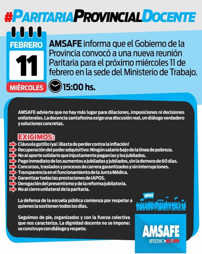 Desde AMSAFE comunicaron que el Gobierno de la Provincia de Santa Fe convocó a una nueva reunión de la Paritaria Docente, que se realizará mañana, miércoles 11 de febrero, a las 15:00 horas, en la sede del Ministerio de Trabajo.