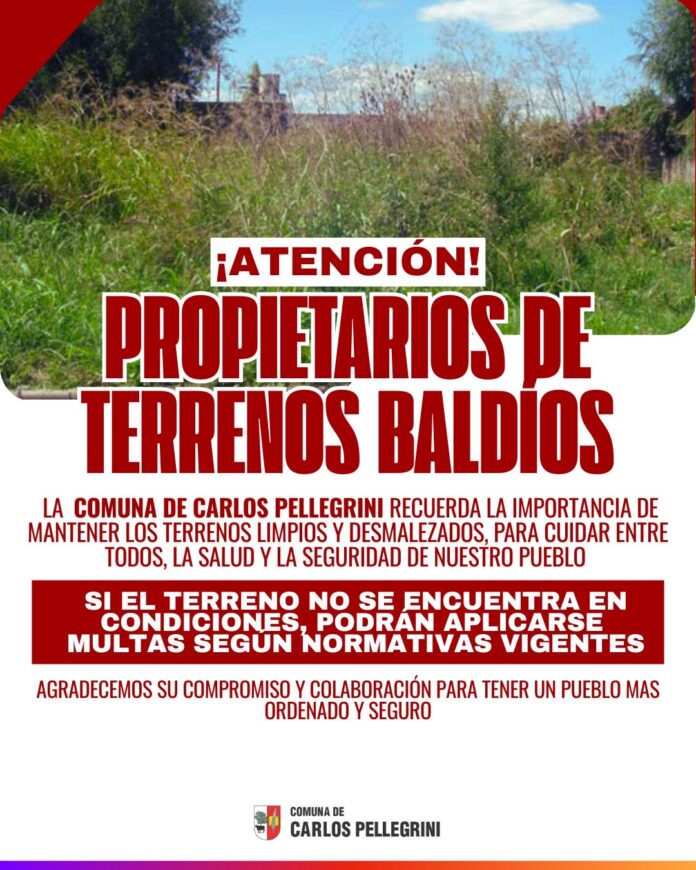La Comuna de Carlos Pellegrini recordó a los propietarios de terrenos baldíos la importancia de mantenerlos limpios y desmalezados, como una medida fundamental para cuidar la salud y la seguridad de toda la comunidad.