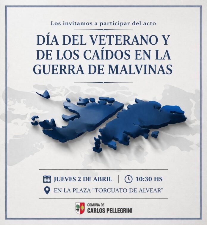 La Comuna de Carlos Pellegrini invita a toda la comunidad a participar del acto conmemorativo por el Día del Veterano y de los Caídos en la Guerra de Malvinas, una fecha significativa para recordar y honrar a quienes defendieron la Patria con honor y valentía.