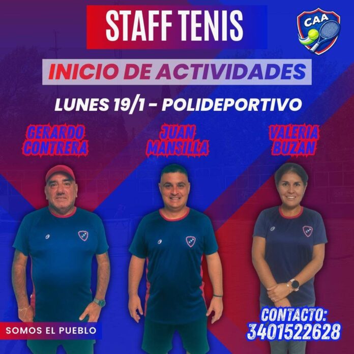 Según informaron desde la subcomisión de tenis, este año llega con un avance significativo: serán tres los profesores a cargo de la disciplina, lo que permitirá ampliar la oferta de horarios y mejorar la organización de los grupos, tanto para la escuelita, las categorías formativas como para adultos: Gerardo Contreras, Juan Mansilla y Valeria Buzán.