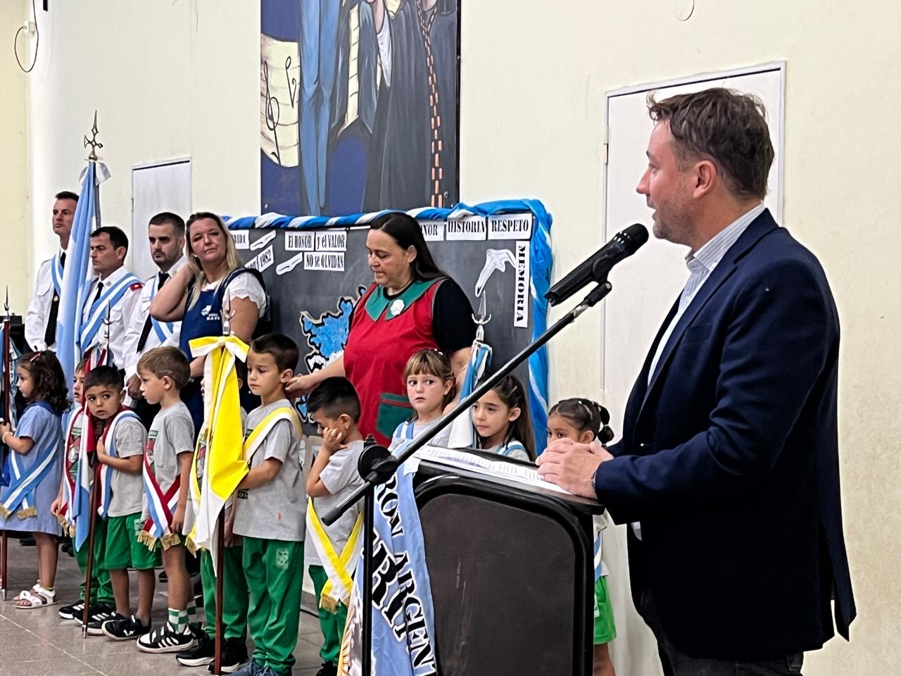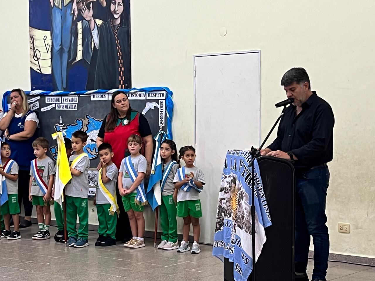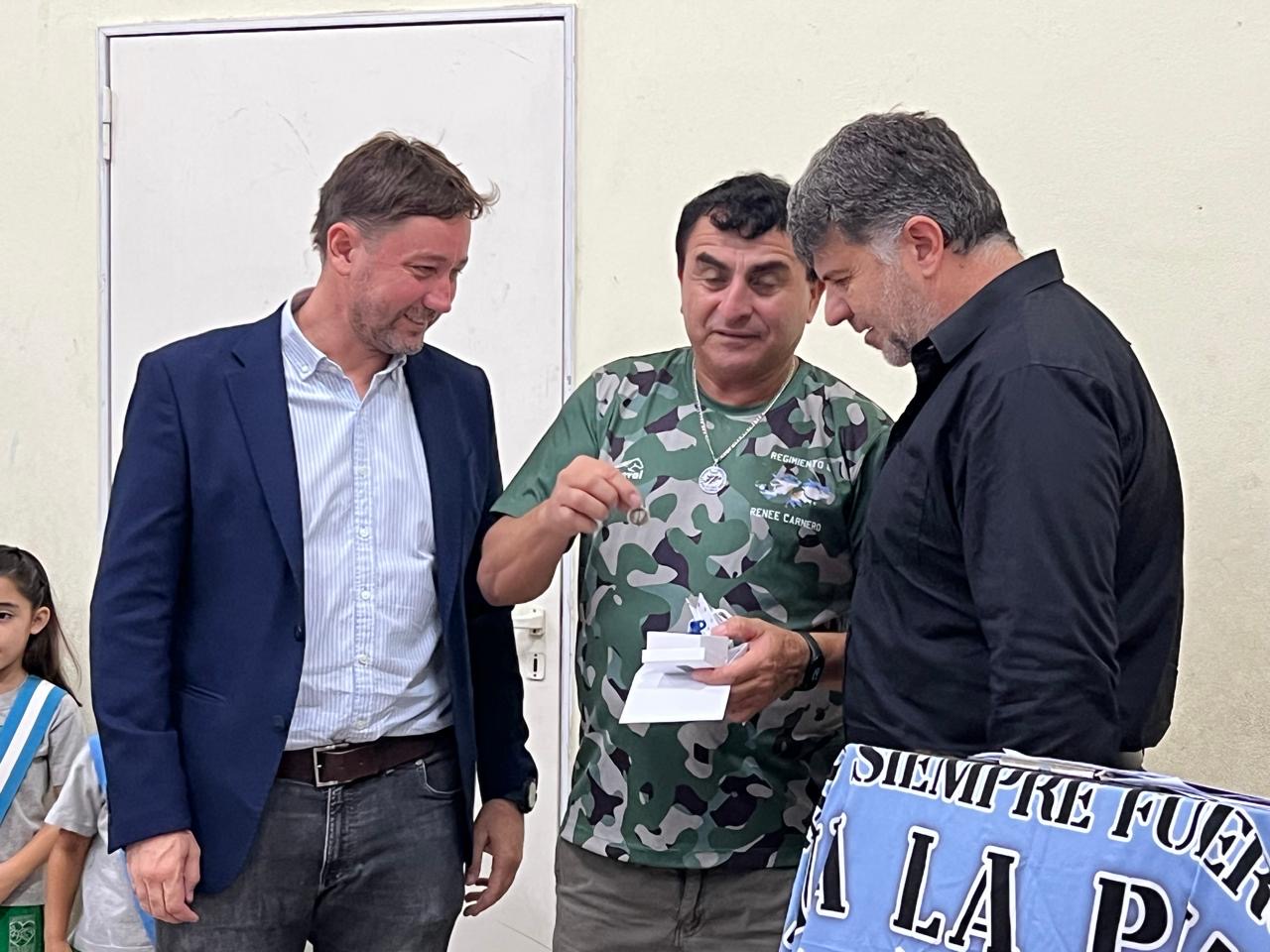 La ceremonia se desarrolló en el SUM de la Escuela Sagrado Corazón y contó con un momento muy especial: el reconocimiento a René Carnero, único pellegrinense que pisó suelo malvinense. En su honor, se descubrió una placa que fue colocada en la Plaza Torcuato de Alvear.