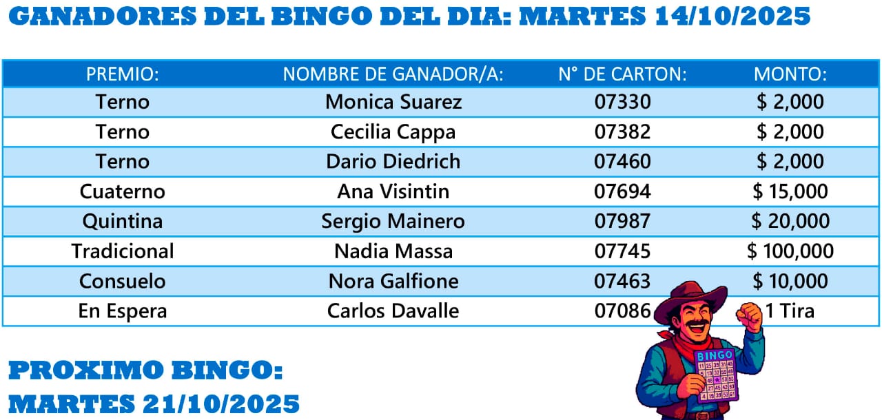 Se efectuó el sorteo del Bingo del Centro de Jubilados y Pensionados de Carlos Pellegrini e informamos quienes resultaron ganadores de los premios.