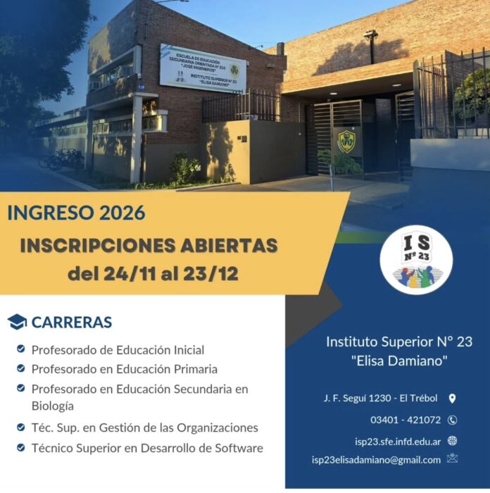 El Instituto Superior N° 23 “Elisa Damiano”, con sede en la ciudad de El Trébol, informó que ya se encuentran abiertas las inscripciones para el ciclo lectivo 2026, las cuales se extenderán hasta el 23 de diciembre.