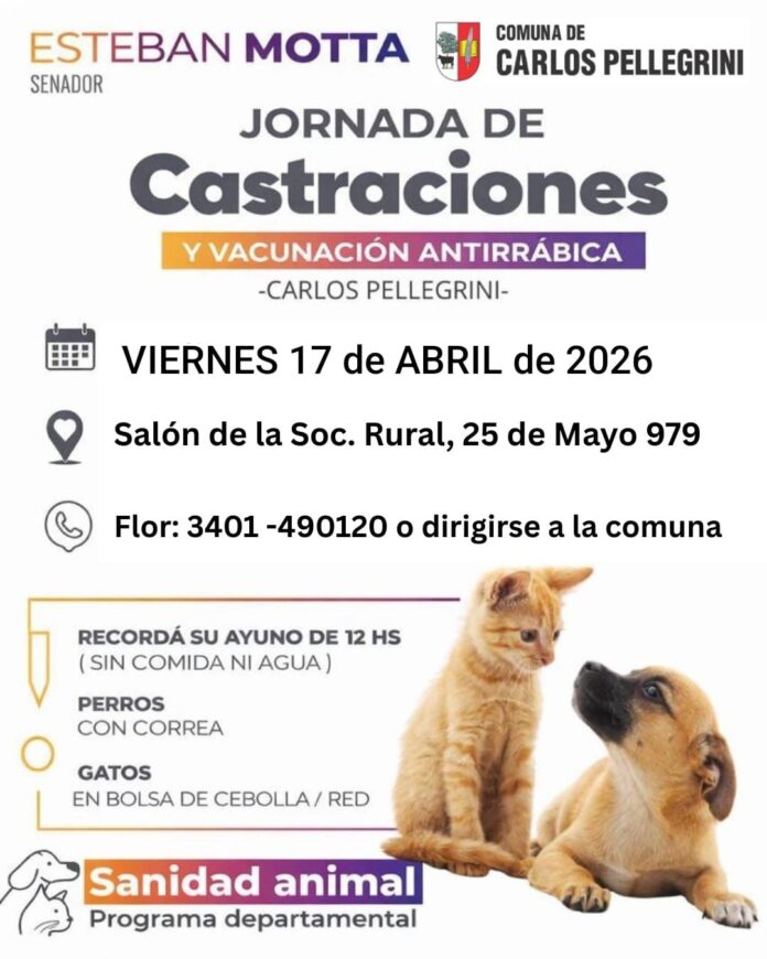 En el marco del programa de sanidad animal impulsado en el departamento San Martín, el senador Esteban Motta junto a la Comuna de Carlos Pellegrini llevarán adelante una jornada de castraciones y vacunación antirrábica destinada a perros y gatos de la localidad.