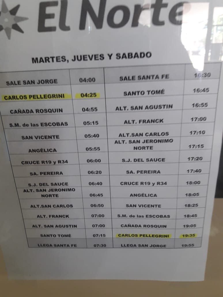 Desde la Boletería de Transur, Claudia Venezia informó los horarios: EMPRESA EL NORTE: «Hacia Santa Fe hay coches los días lunes, miércoles y viernes a las 6,20 de la mañana. De Santa Fe para acá Pellegrini, los mismos días, saliendo a las 18,15 horas».