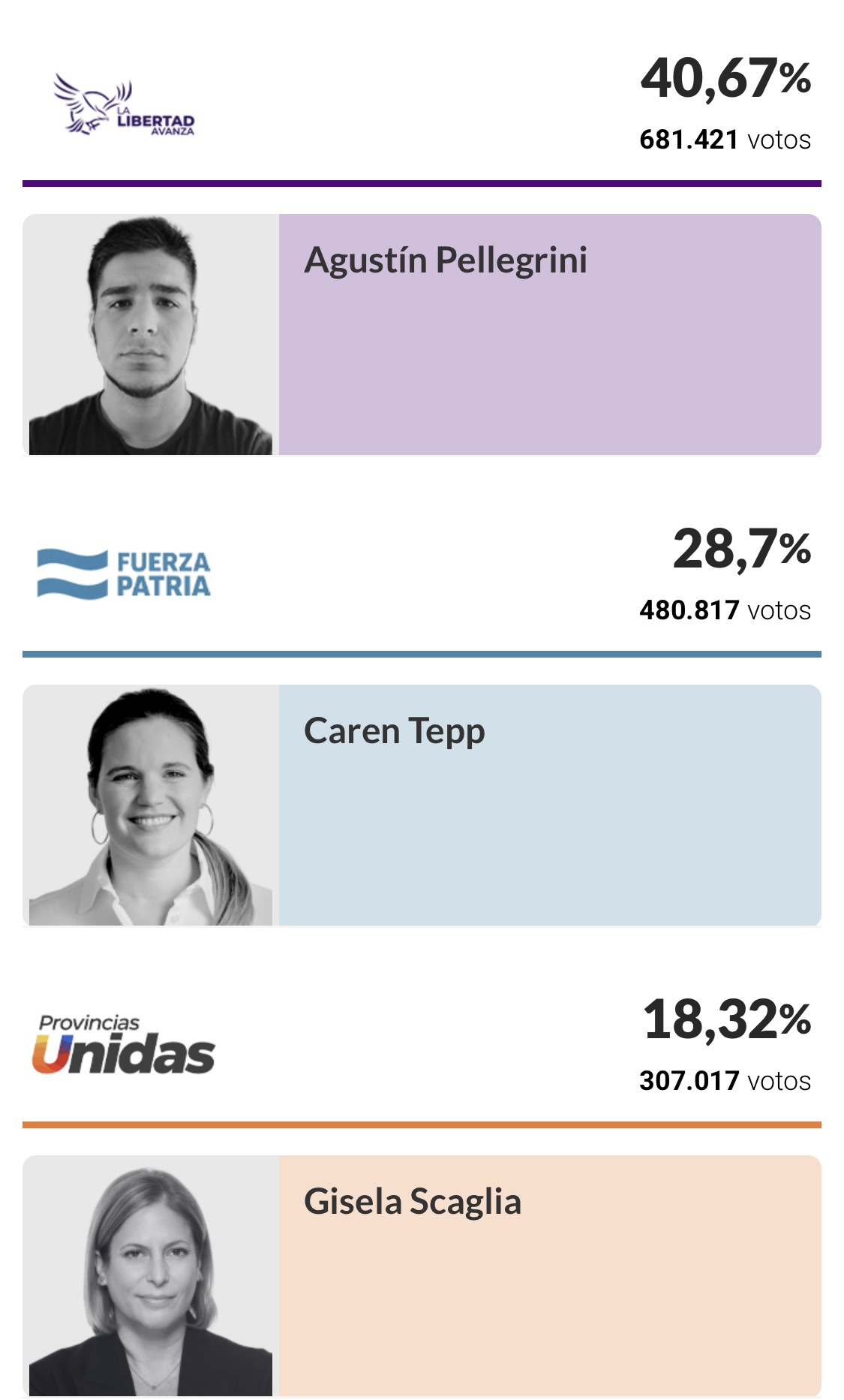 El oficialismo nacional se impuso con el 40,73% de los votos en la provincia y logra sumar cuatro bancas de diputados. Fuerza Patria estaba segundo con el 28,65% y mantiene sus tres lugares, mientras que Provincias Unidas, el frente de Pullaro, no logró romper la polarización y se queda con dos.